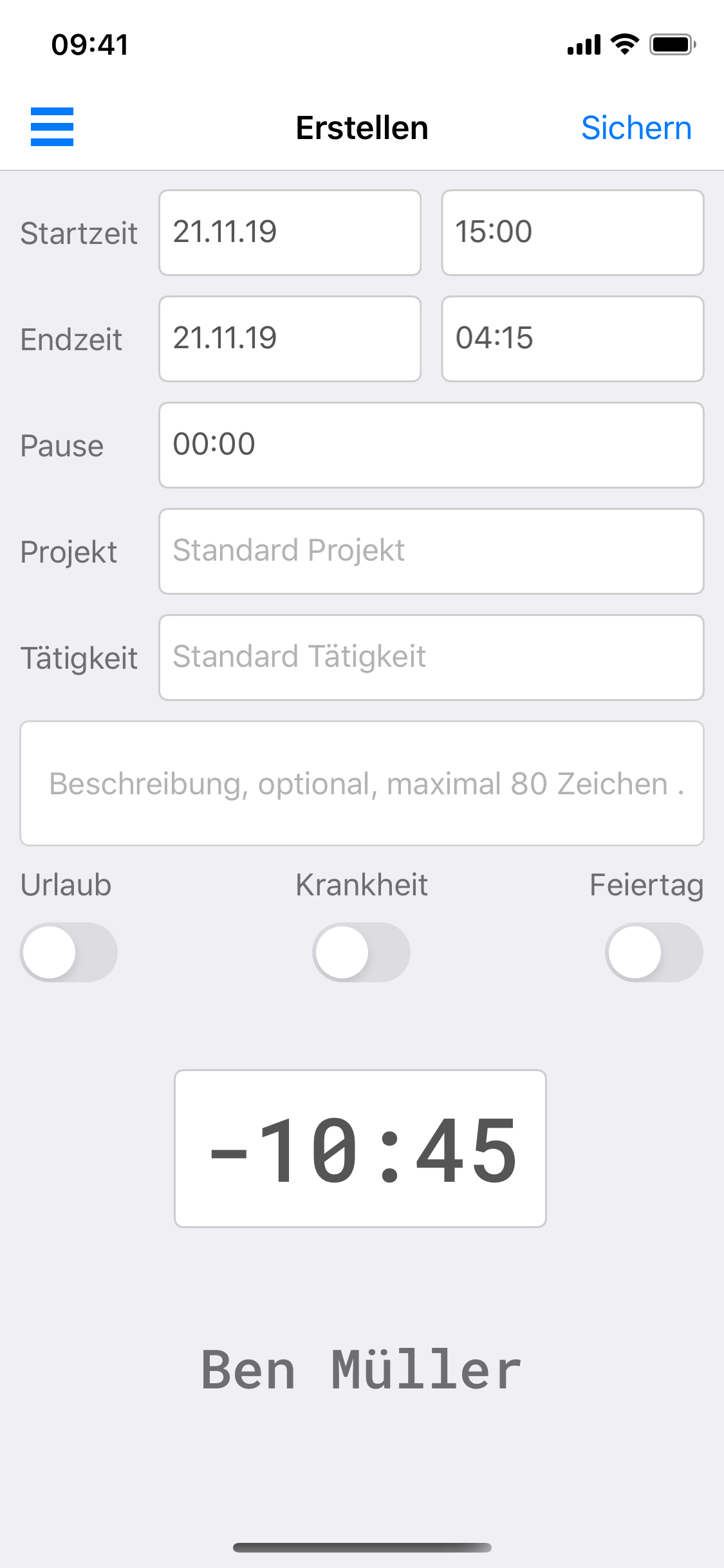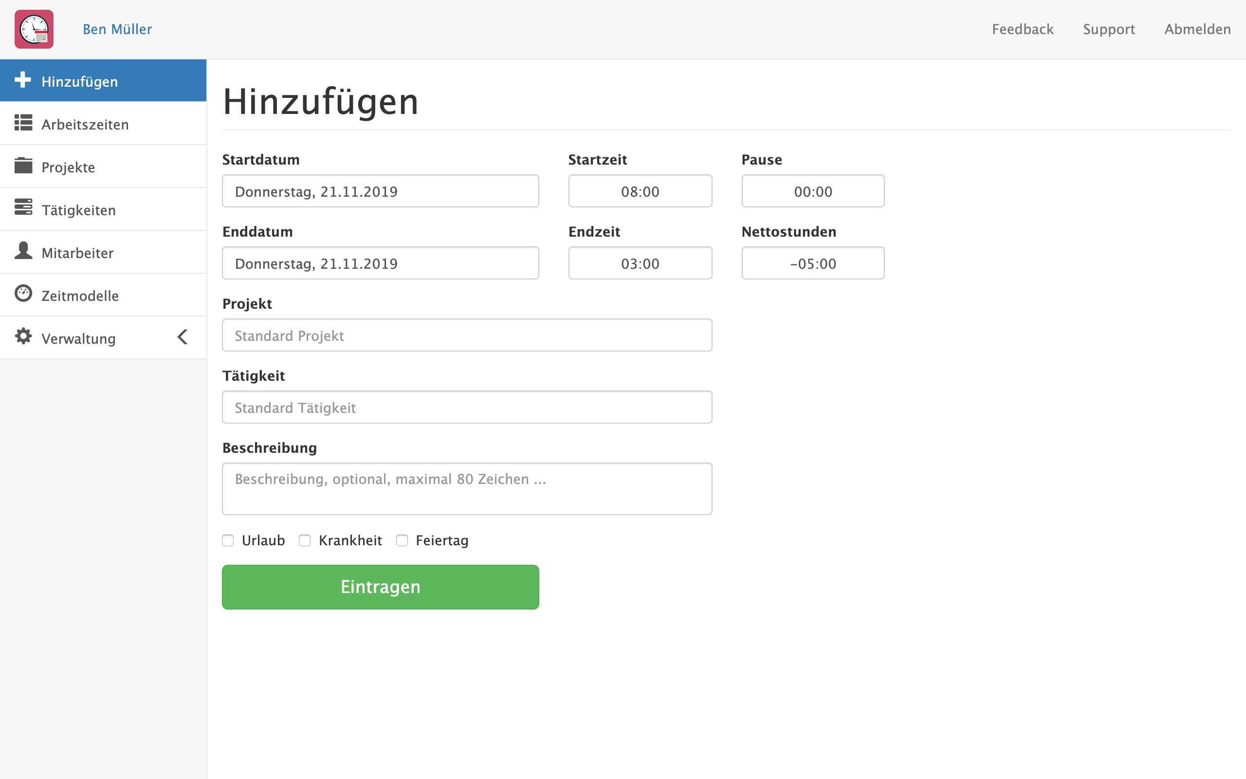 1) Gehen Sie dazu im „Menü“ auf „Hinzufügen“, wählen Sie das gewünschte Datum und tragen Sie im neuen „Nettostunden“ Feld, ganz unten, die gewünschten Minusstunden ein, zum Beispiel „-10:45“